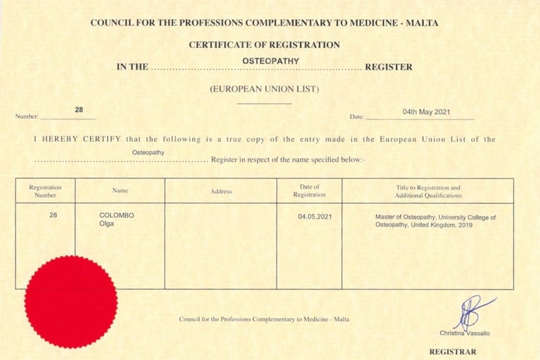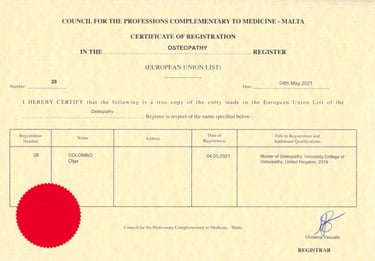 CPCM member - Council for the Professions Complementary to Medicine - Malta Osteopathic Council - registration No. 28