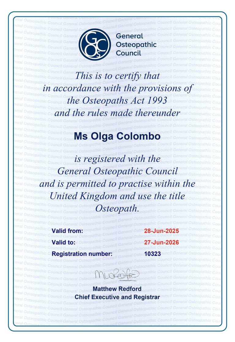 GOsC member - General Osteopathic Council - UK Osteopathic Council - registration No. 10323
